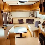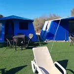 The campsite includes a kitchen with a refrigerator, an oven, and a stovetop, allowing guests to prepare their own meals.